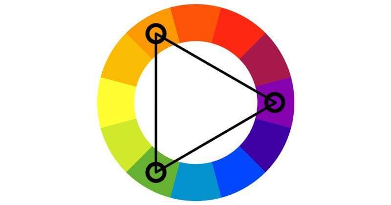 Skema warna triadik menggunakan tiga warna yang posisinya membentuk segitiga sama sisi pada roda warna. Contohnya nih, Ma, warna merah, kuning, dan biru.