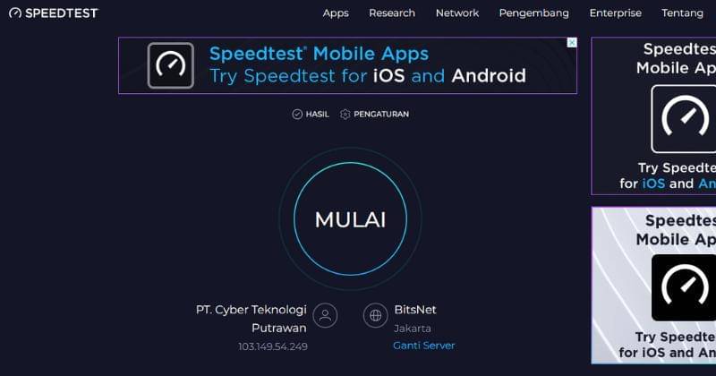 Pengguna kemudian dapat memulai tes dengan mengklik tombol "Mulai Uji". Tes ini akan mengukur kecepatan download dan upload pengguna, serta ping mereka.