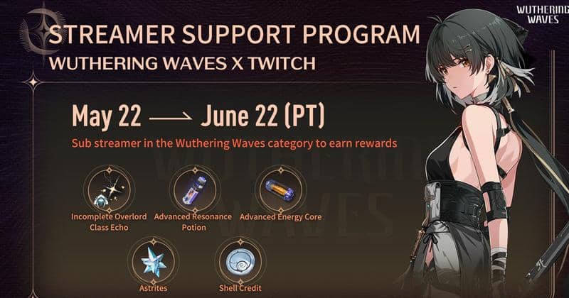 Selain kedua hadiah di atas, ada lagi nih hadiah bonus Wuthering Waves khusus untukmu yang memiliki aplikasi Twitch. Kamu perlu antara subscribe kenapa akun resmi Wuthering Waves di Twitch atau memberikan dua Twitch subscriptions kepada streamer Wuthering Waves dari tanggal 22 May sampai 22 Juni tahun 2024.
