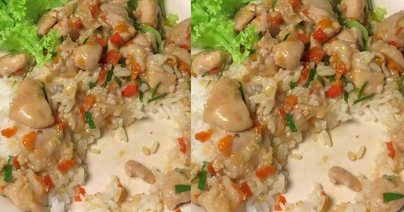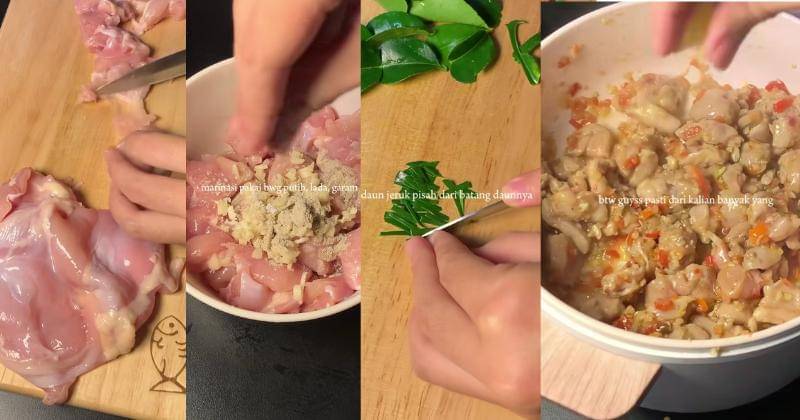 - Marinasi ayam yang elah dipotong dadu menggunakan bawang putih, lada, dan garam
