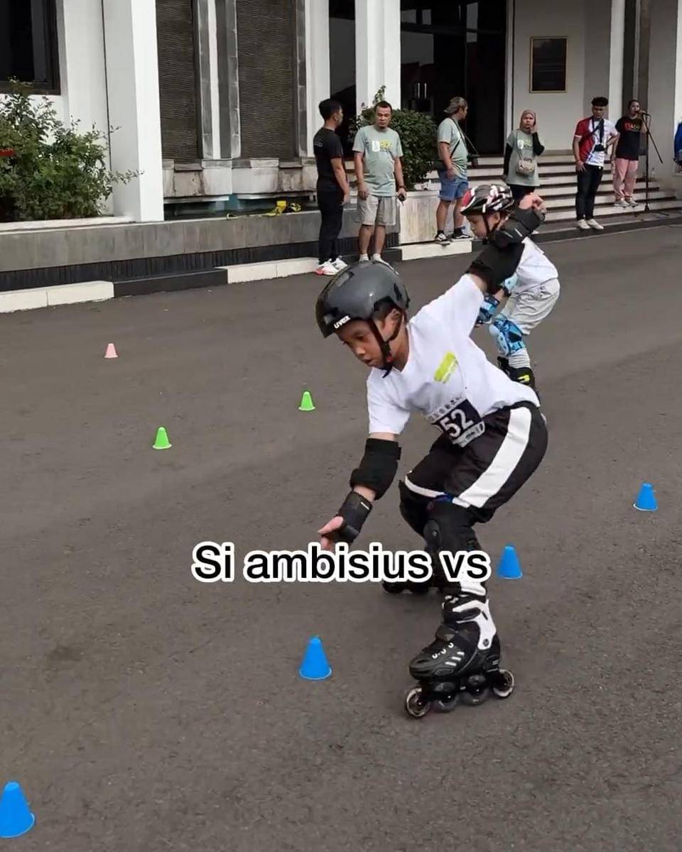 Menggunakan sepatu roda berwarna hitam, Xabiru meluncur dengan hati-hati berusaha mengalahkan lawan yang ada di sebelahnya. Luncuran yang diberikannya pun tak main-main lantaran begitu mulus dan cepat.