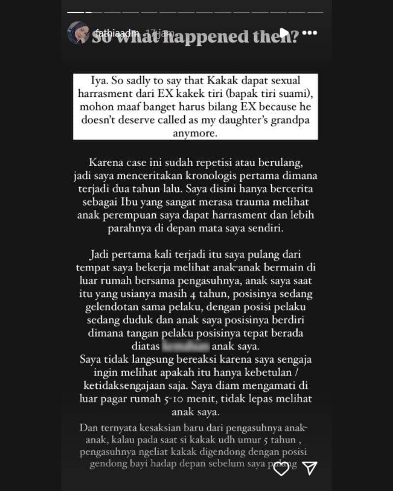 Melalui akun Instagram pribadinya, Fathia mengungkap secara lantang bagaimana kasus itu bisa terjadi. Ya, kamu tidak salah baca. Dari cerita Fathia, dia mengungkap kalau anaknya, A, dilecehkan oleh kakeknya sendiri yang merupakan papa mertua Fathia.