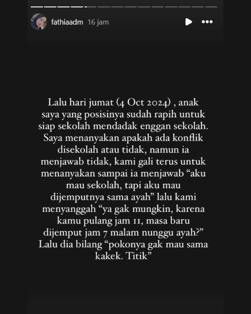 Pada 4 Oktober 2024 lalu, A mendadak tidak ingin pergi ke sekolah. Padahal saat itu, A sudah dalam keadaan rapi untuk siap pergi ke sekolah. Fathia pun penasaran dengan alasan A yang mendadak tidak ingin ke sekolah.