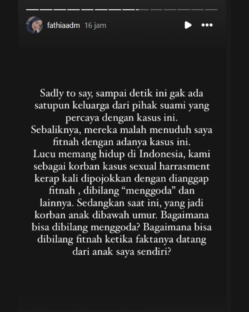 "Lucu memang hidup di Indonesia, kami sebagai korban kasus sexual harrasment kerap kali dipojokkan dengan dianggap fitnah, dibilang 'menggoda' dan lainnya. Sedangkan saat ini, yang jadi korban anak di bawah umur. Bagaimana bisa dibilang menggoda? Bagaimana bisa dibilang fitnah ketika faktanya datang dari anak saya sendiri," tulis Fathia.