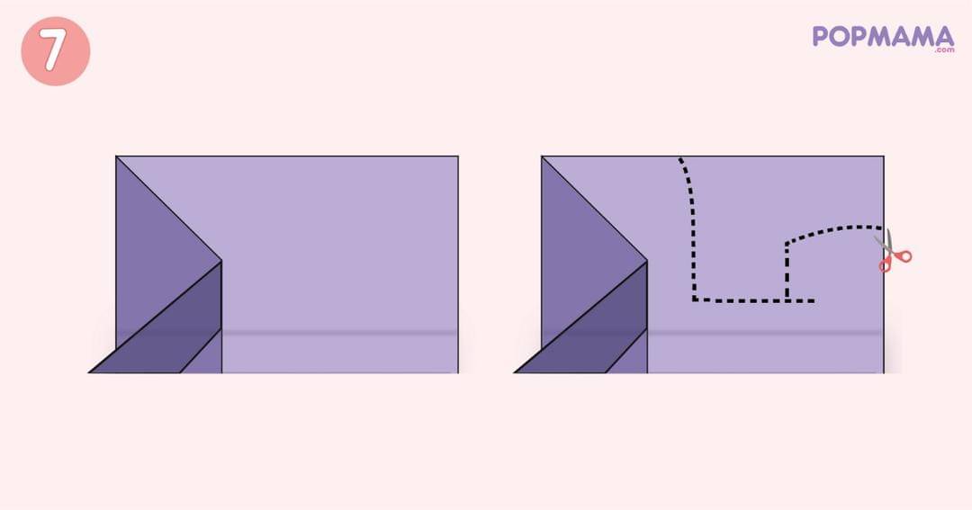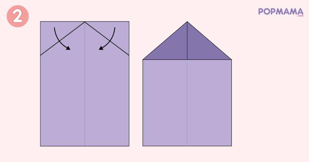 Buka kembali lipatan kertas, sehingga bentuknya kembali seperti kertas biasa. Setelahnya, lipat bentuk segitiga kecil dari pojok atas kertas ke garis tengah bekas lipatan sebelumnya.