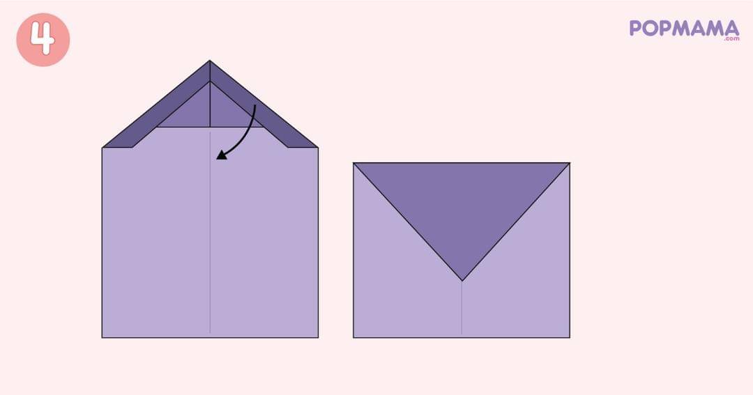 Ujung segitiga bagian bawah dari kertas yang seperti amplop tersebut perlu dilipat ke atas sehingga membuat segitiga lain.