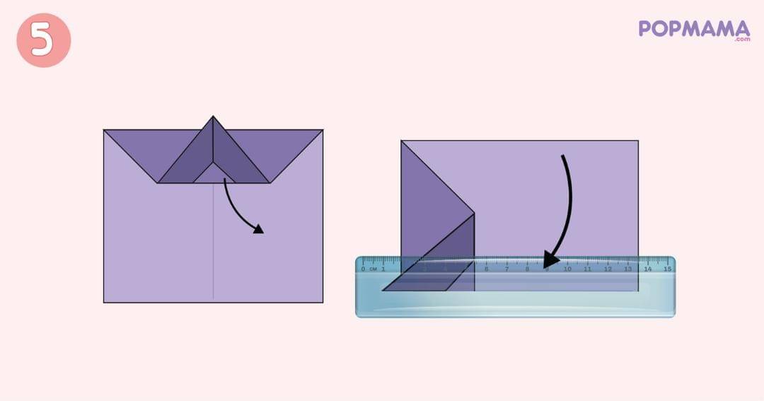 Caranya adalah dengan berusaha melipat kembali kertas hingga ada bagian kertas yang menutupi segitiga kecil yang mengarah ke bawah. Segitiga kecil tersebut sudah kita dapatkan dari langkah sebelumnya.