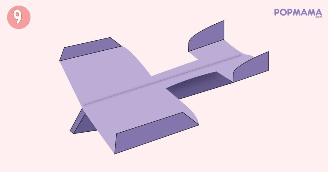 Setelah menggunting pola, buka lagi kertas yang sudah lebih terlihat seperti pesawat itu. Setelah dibuka, lipat sedikit bagian paling luar tiap sayap ke atas agar dapat terbang lebih lama.