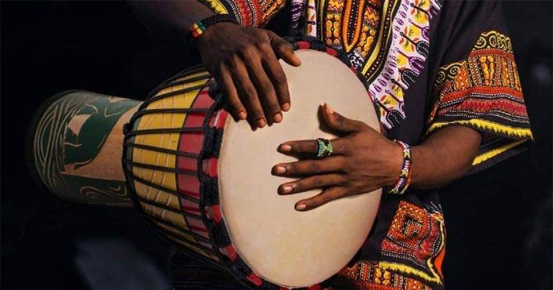 Alat musik yang dimainkan dengan menggunakan tangan ini berasal dari Afrika Barat. Nama djimbe sendiri berasal dari kata "Anke dje, anke be" yang diterjemahkan menjadi "untuk semuanya berkumpul dalam damai" dan menggambarkan kegunaan drum ini bagi masyarakat di sana.