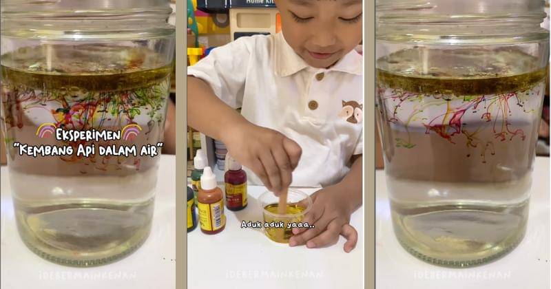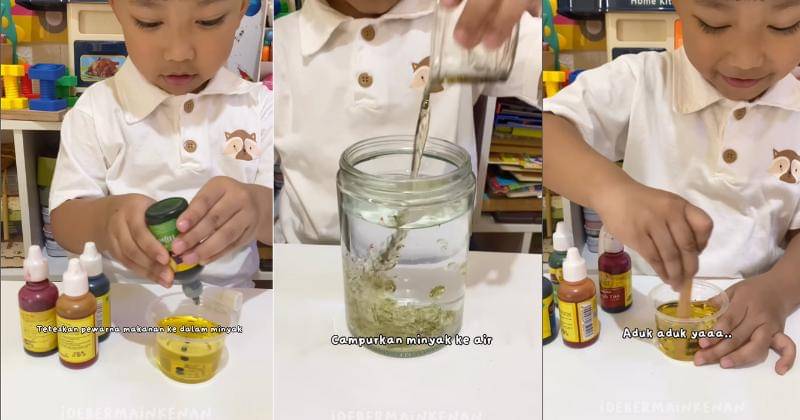 Akun Instagram.com/idebermainkenan menjelaskan mengapa pewarna makanan yang dicampur dengan minyak mampu terurai di dalam air.