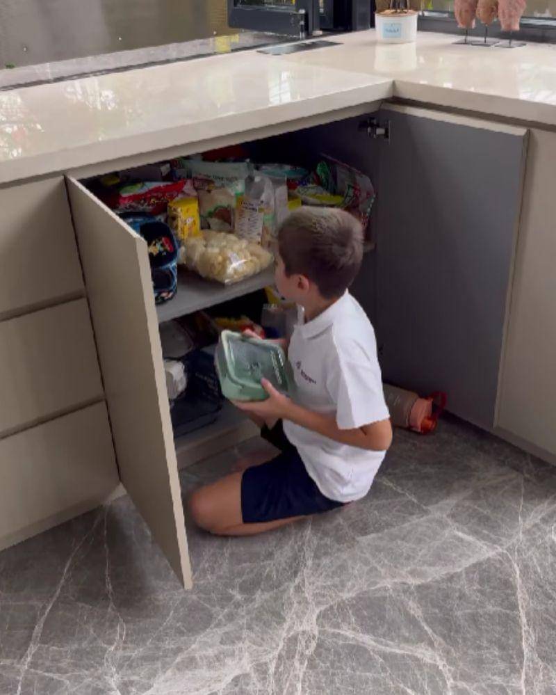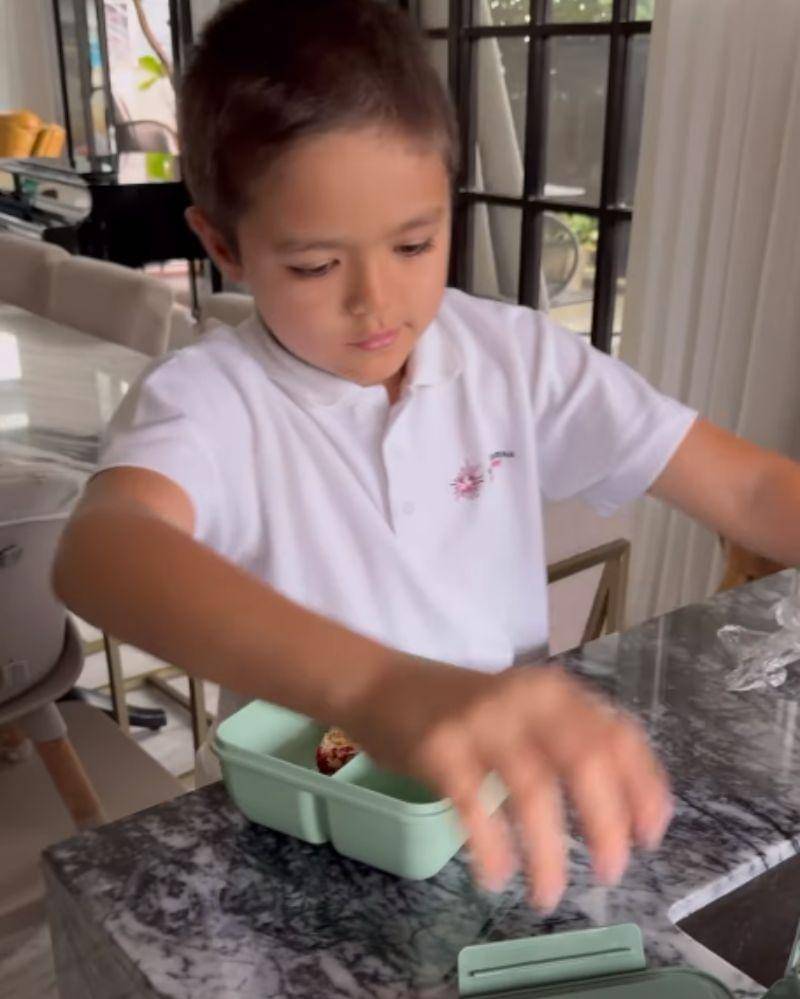 Masih dari video yang sama, kakak dari baby Don itu terlihat sibuk mencari kotak makan yang akan ia gunakan untuk membawa bekal berupa kue dan buah stroberi kesukaannya. Setelah menemukan kotak makan yang ia cari, El Barack langsung memasukkan makanan yang ia inginkan.