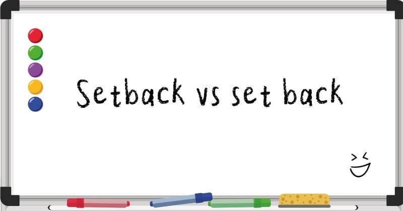 Setback (tanpa spasi) adalah kata benda yang berarti kemunduran atau hambatan, sedangkan set back (dengan spasi) adalah frasa kerja yang berarti menunda atau menghambat sesuatu.