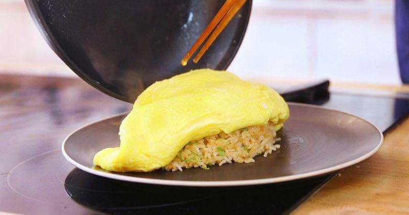- Jika telur sudah matang, tata nasi diatas telur dadar tersebut.
