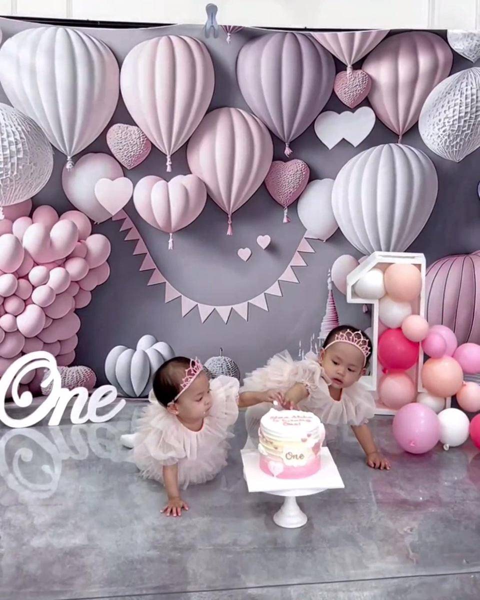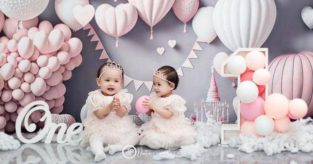 Penampilan Alma dan Alsha semakin terlihat manis berkat aksesori berupa mahkota yang menghiasi kepala mereka. Terlihat berbagai macam hiasan balon didominasi warna pink yang menghiasi latar belakang foto.