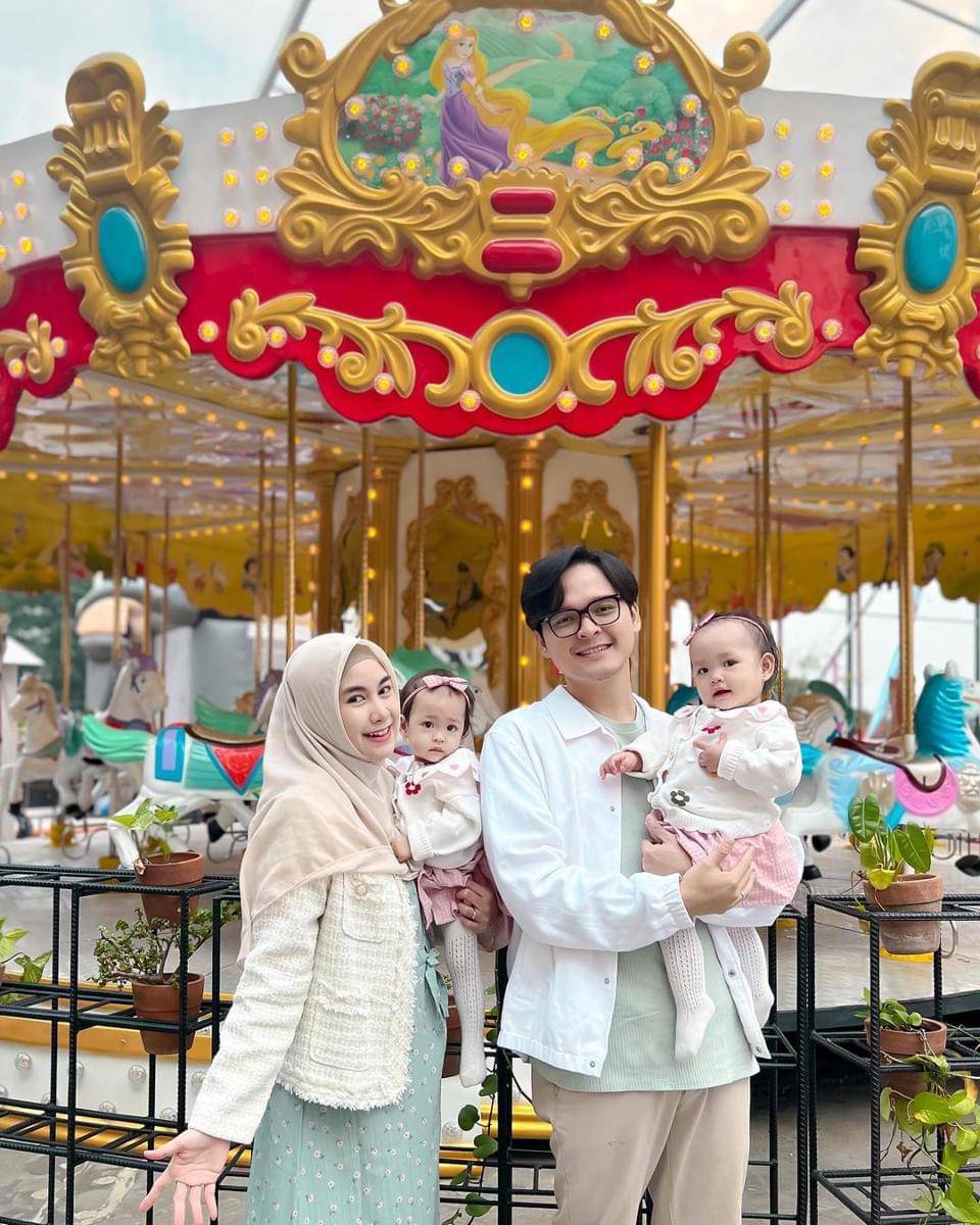 Keluarga kecil ini tidak lupa untuk berfoto di arena permainan komidi putar. Baik Alma dan Alsha tampak begitu senang ketika berfoto di gendongan orangtua mereka.