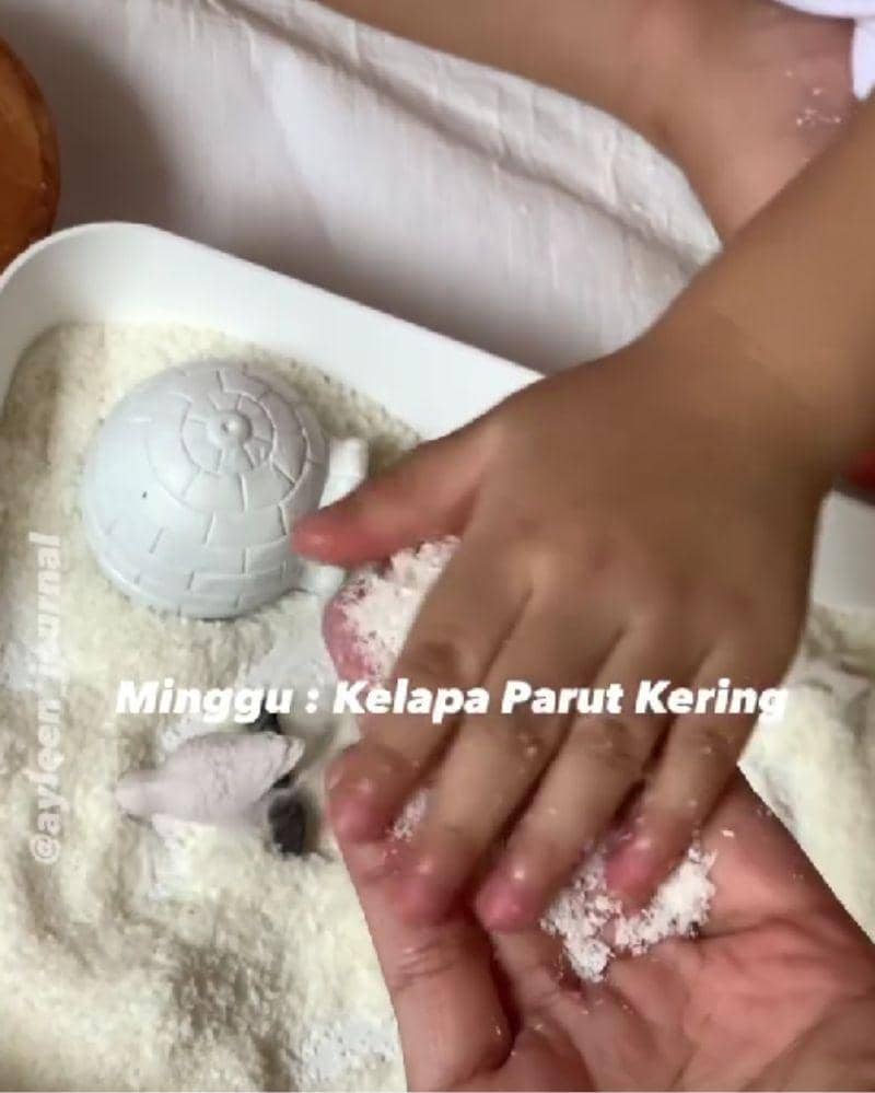 Biar nggak bosan dengan tekstur yang itu-itu aja, anak mama juga bisa bermain sensory play dengan bahan yang lebih kasar menggunakan kelapa parut. Bahannya pun hanya kelapa parut sisa tak terpakai, kemudian sangrai tanpa minyak hingga mengering.