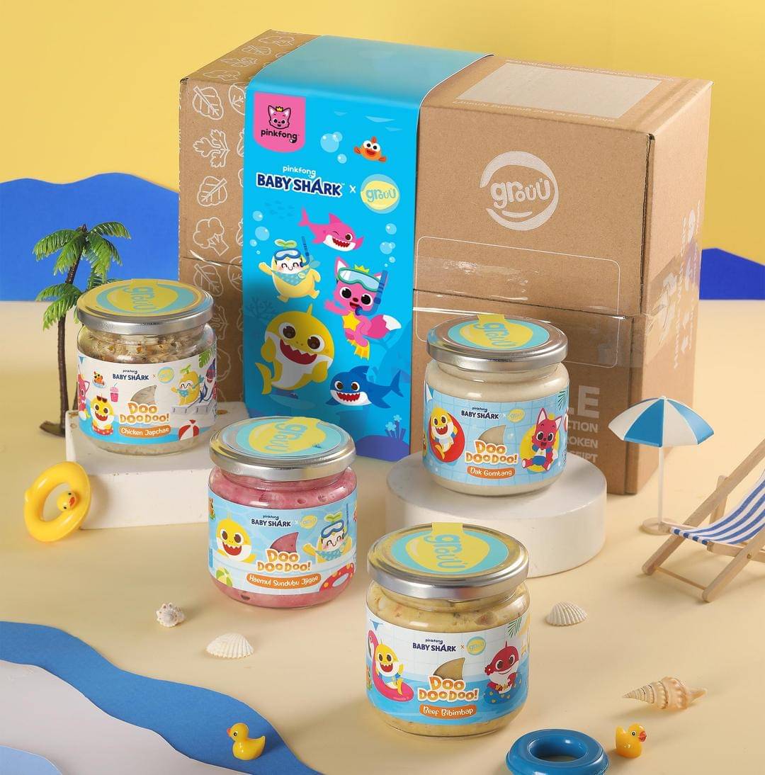 Kolaborasi ini menghadirkan varian menu makanan MPASI dan anak bertema korea, dengan desain kemasan yang playful bersama karakter Pinkfong Baby Shark. Kerjasama ini merupakan kolaborasi pertama Grouu dengan perusahaan animasi anak, setelah sebelumnya berkolaborasi dengan Mom Influencer (Irish Bella dan Olivia Lazuardy) dan merek dagang makanan Indonesia (Mangkokku, Padang Merdeka, dan San Gyu by Hangry).