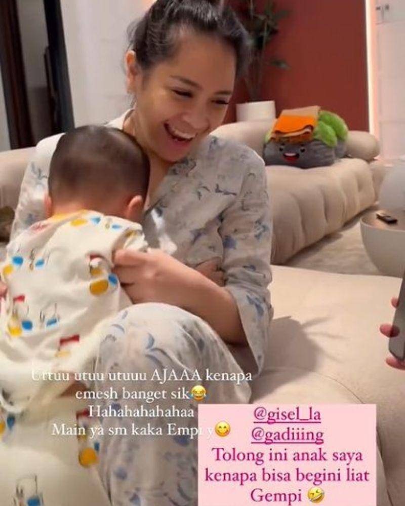 "Tolong ini kenapa anak saya bisa begini liat Gempi," tulis Mama Gigi sembari memberikan emoji tertawa dan menyebutkan akun Instagram kedua orangtua Gempi.