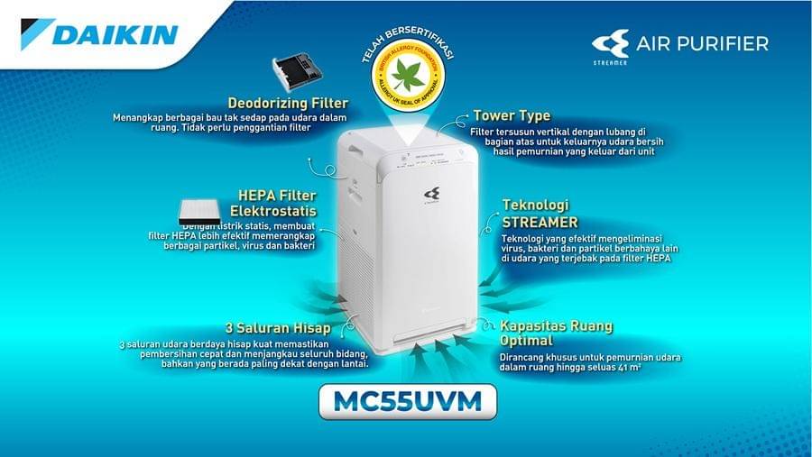 Lalu apa yang bikin air purifier DAIKIN spesial? Tentunya karena MC55 dilengkapi dengan filter HEPA elektrostatis yang berkolaborasi dengan teknologi STREAMER dari DAIKIN. Bila filter HEPA bekerja menyaring polutan di udara, bahkan bakteri dan virus, STREAMER bekerja mengeliminasi berbagai partikel berbahaya yang sudah terjebak dalam filter tadi supaya tak keluar lagi bersama udara yanng dihembuskan air purifier DAIKIN.