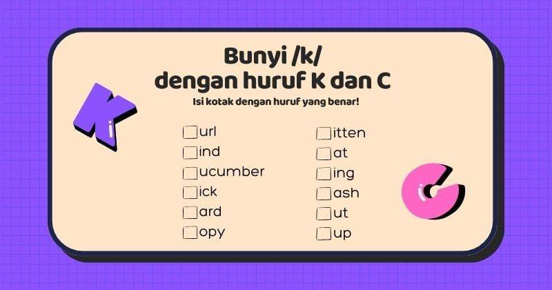 Buat latihan dan permainan yang melibatkan kata-kata dengan bunyi /k/ di awal. Misalnya, mintalah anak-anak untuk mengelompokkan kata-kata ke dalam dua kelompok, satu kelompok menggunakan huruf C dan kelompok lainnya menggunakan huruf K.