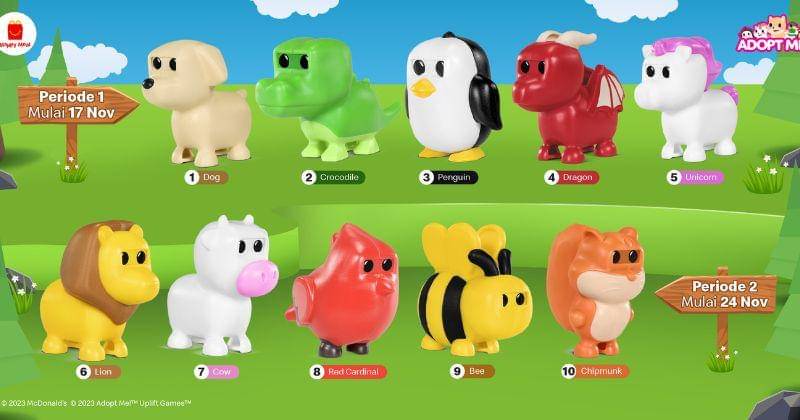 McDonald's Indonesia untuk pertama kalinya menghadirkan rangkaian mainan Adopt Me yang bisa didapatkan dari paket Happy Meal. Terdiri dari 10 jenis karakter, antara lain lebah, penguin, singa, dan lain sebagainya, mainan ini dapat dirakit sendiri serta dilengkapi dengan stiker lucu dan juga pengalaman digital berupa simulasi merawat hewan peliharaan yang menyenangkan. Happy Meal Adopt Me tersedia di seluruh restoran McDonald's Indonesia mulai dari 17 November sampai dengan 21 Desember 2023.
