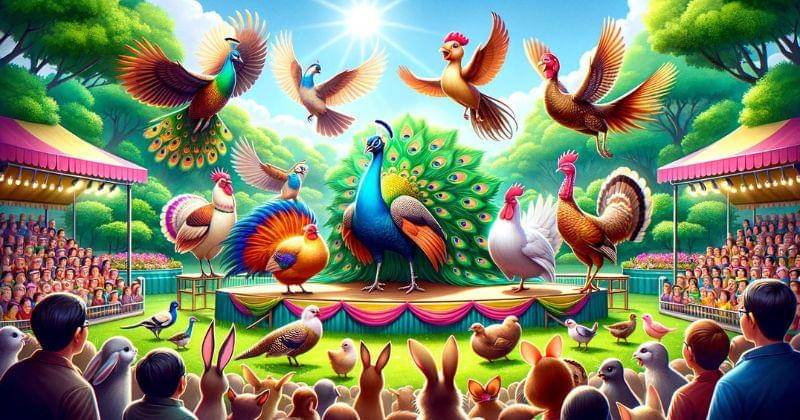 Satu persatu peserta maju sambil menunjukan gerakan-gerakannya. Mereka melenggak-lenggok untuk menarik perhatian para penonton. Batik menunjukan keindahan bulunya. Pelung dan Kalkun menunjukan keperkasaanya. Merak dan Pegar sama-sama menunjukan keanggunannya. Para hewan-hewan lain yang menyaksikan bersorak dengan semangat.
