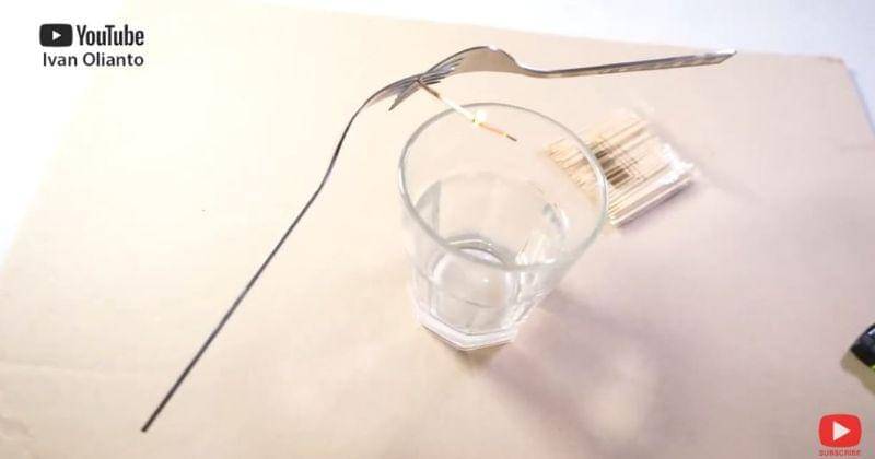 - Bakar ujung tusuk gigi atau batang korek api yang ada di dalam gelas. Meski sudah dibakar, garpu tersebut masih akan dalam keaadan yang seimbang.
