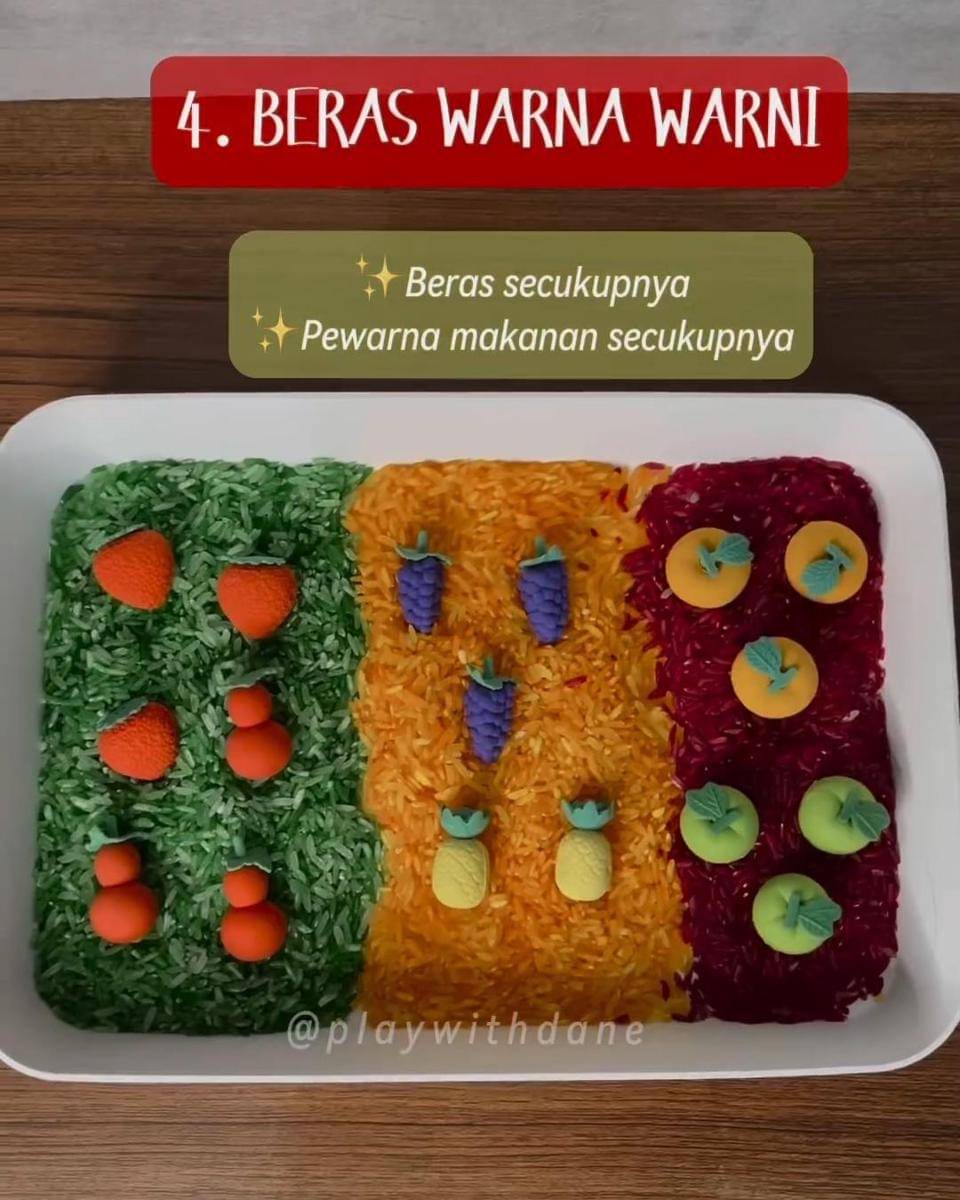 Beras warna-warni dapat membantu merangsang indra penglihatan dan peraba anak. Cobalah memilih warna yang mencolok untuk dipadukan dengan terkstur beras di rumah. Sehingga, anak akan lebih tertarik untuk meremas-remasnya menggunakan tangan kosong.