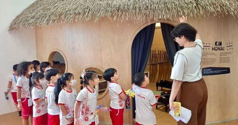 Mulai dari berbagai alat musik tradisional Indonesia yang tentunya bisa anak mainkan sambil mempelajari alat musik dari mana itu. Lalu, ada tempat untuk bermain wayang.