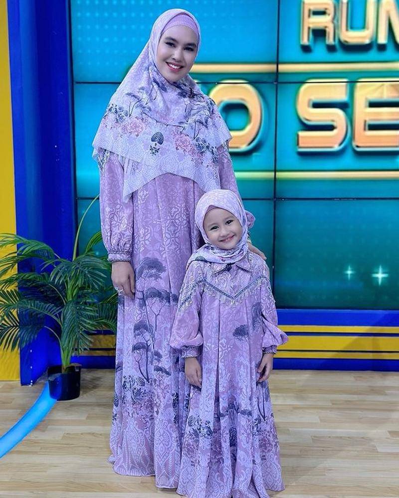 Mama Karput dan Khalisa kompak menggunakan gamis bernuansa ungu cerah yang dipadukan dengan hijab berwarna senada. Nampaknya, gamis yang mereka gunakan merupakan one set khusus untuk Mama dan putrinya.