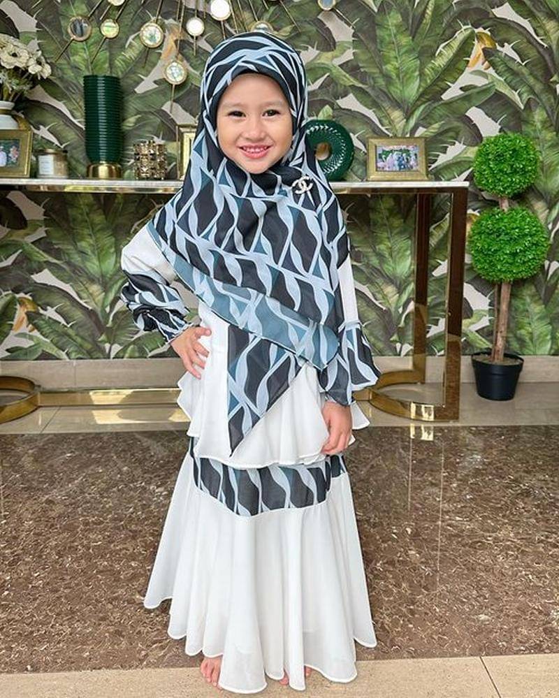 Sementara untuk gamisnya, Mama Kartika memilihkan gamis putih dengan ornamen rampel. Di bagian ¾ gamis serta lengannya terdapat motif serupa dengan motif hijab yang Khalisa pakai. Masyallah banget ya, Ma.