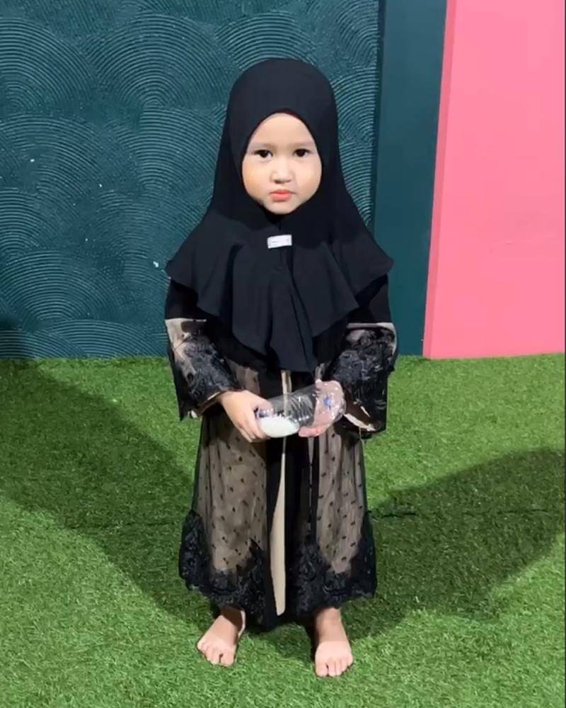 Warna hitam memang tidak pernah salah dipakai oleh laki-laki, perempuan, dewasa, remaja, hingga anak-anak. Seperti Khalisa yang tampak manis menggunakan gamis dan kerudung hitam.