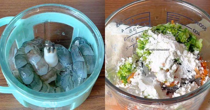 - Masukkan udang kupas yang sudah dibersihkan dan telur putih ke dalam chopper.