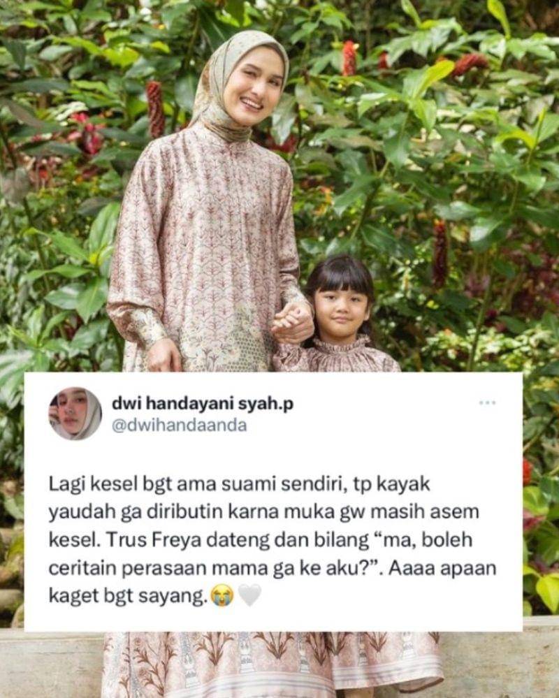 "Terus Freya datang dan bilang "ma, boleh ceritain perasaan mama ga ke aku". Aaa apaan kaget bgt sayang," tulis Dwi Handa dalam cuitan di akun X miliknya.