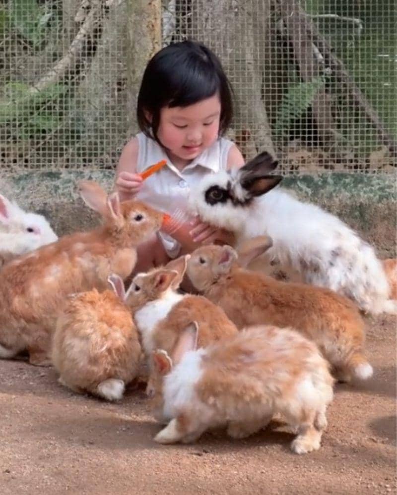 Alih-alih takut, gadis berusia 4 tahun itu justru terlihat enjoy saat berada di antara kerumunan kelinci yang begitu banyak.
