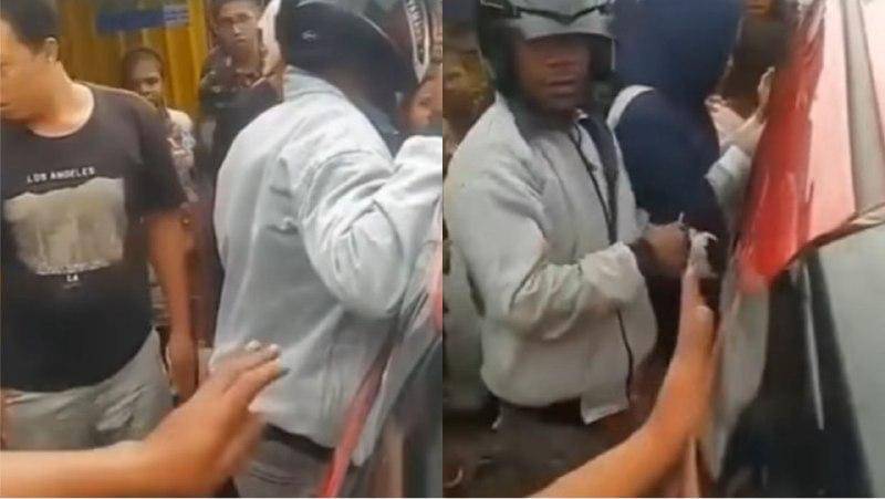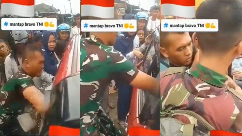 Tiba-tiba, dalam video tersebut seorang lelaki berpakaian TNI datang dan membelah lautan manusia hingga sampai di hadapan pintu mobil. Di sana, satu lelaki berusaha memecahkan kaca mobil.