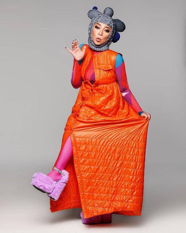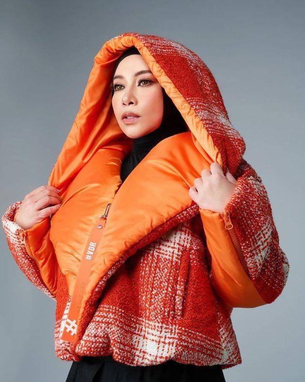 Tubuhnya dibalut coat berwarna oranye dan celana legging shocking pink. Sepatu wedges berbahan dasar bulu berwarna pink menyempurnakan penampilannya. Tak lupa, ia juga melengkapi gayanya dengan hijab rajutan berwarna abu-bau dengan aksen unik.