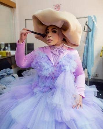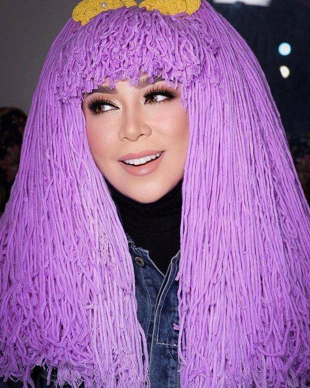 6. Rambut palsu berwarna ungu menjadi highlight utama dalam penampilannya