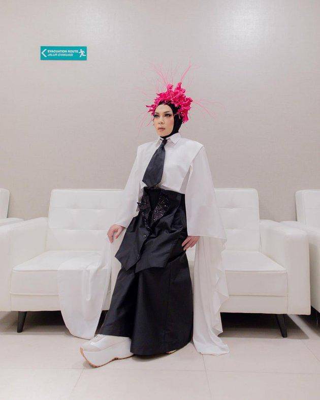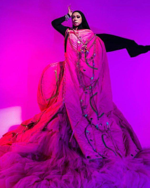 Sang Musisi tampil nyentrik sekaligus glamor mengenakan inner hitam yang dibalut outer berwarna shocking pink. Uniknya, outer tersebut mempunyai model yang super lebar hingga menyentuh lantai. Hijab hitam menjadi andalannya untuk penampilannya kali ini.