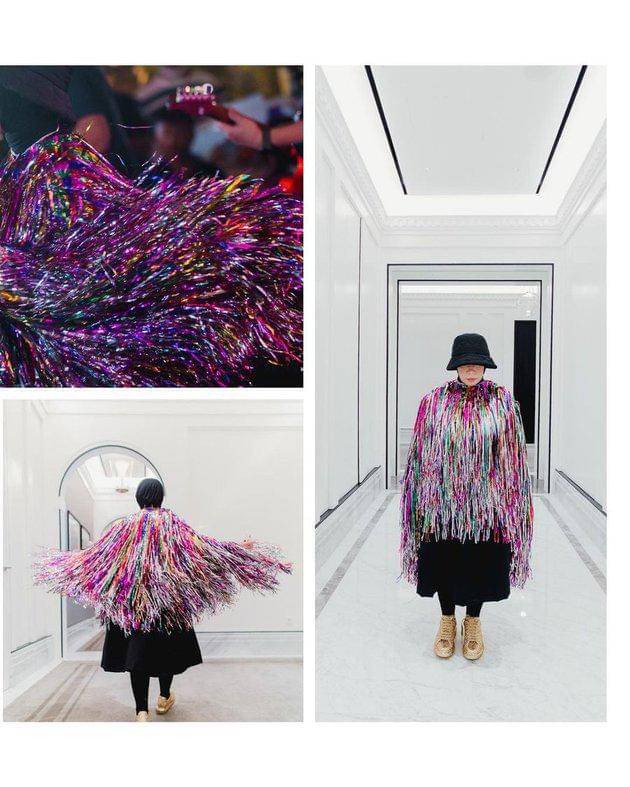 Namanya bukan Melly Goeslaw jika tidak tampil heboh. Busana rumbai berwarna-warni yang dikenakannya mampu membuatnya tampil begitu colorful. Penampilannya semakin kece berkat bucket hat hitam yang warnanya senada dengan hijab miliknya.