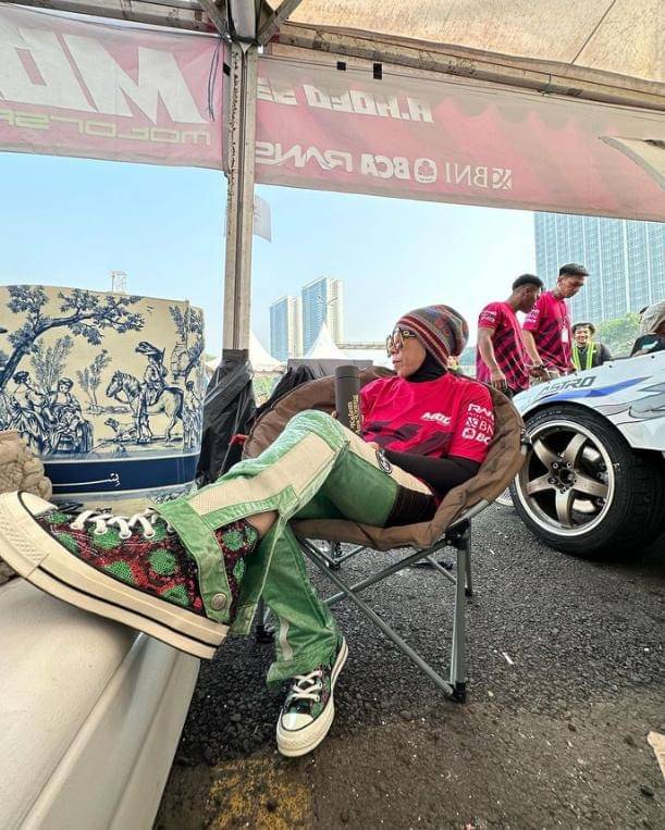 Gaya nyentrik Melly Goeslaw tidak hanya saat pemotretan saja, tetapi juga ketika menonton acara drifting. Dalam balutan busana sporty, ia mengenakan atasan kaus berwarna merah yang mempunyai aksen kotak-kotak menyerupai motif bendera di area sirkuit.