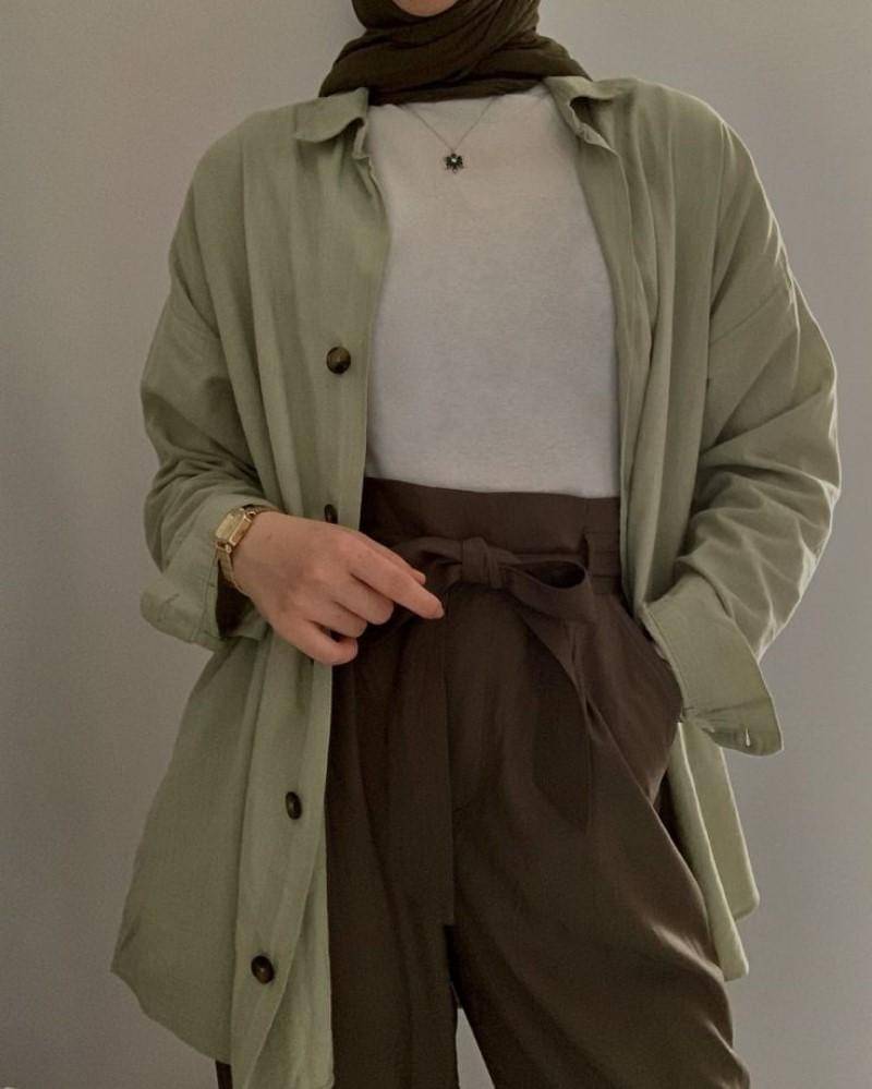 Gaya santai selanjutnya adalah celana dan kaus dengan outer kemeja oversized. Mama bisa bermain dengan berbagai macam warna yang sesuai dengan kepribadian.