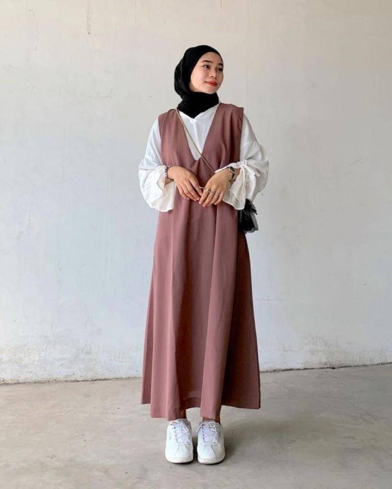 Kalau mengenakan dress begitu saja terasa membosankan, Mama bisa menggunakan non sleeve dress sebagai outer. Sedangkan innernya, gunakan blouse, kemeja, atau kaus dengan warna yang netral.