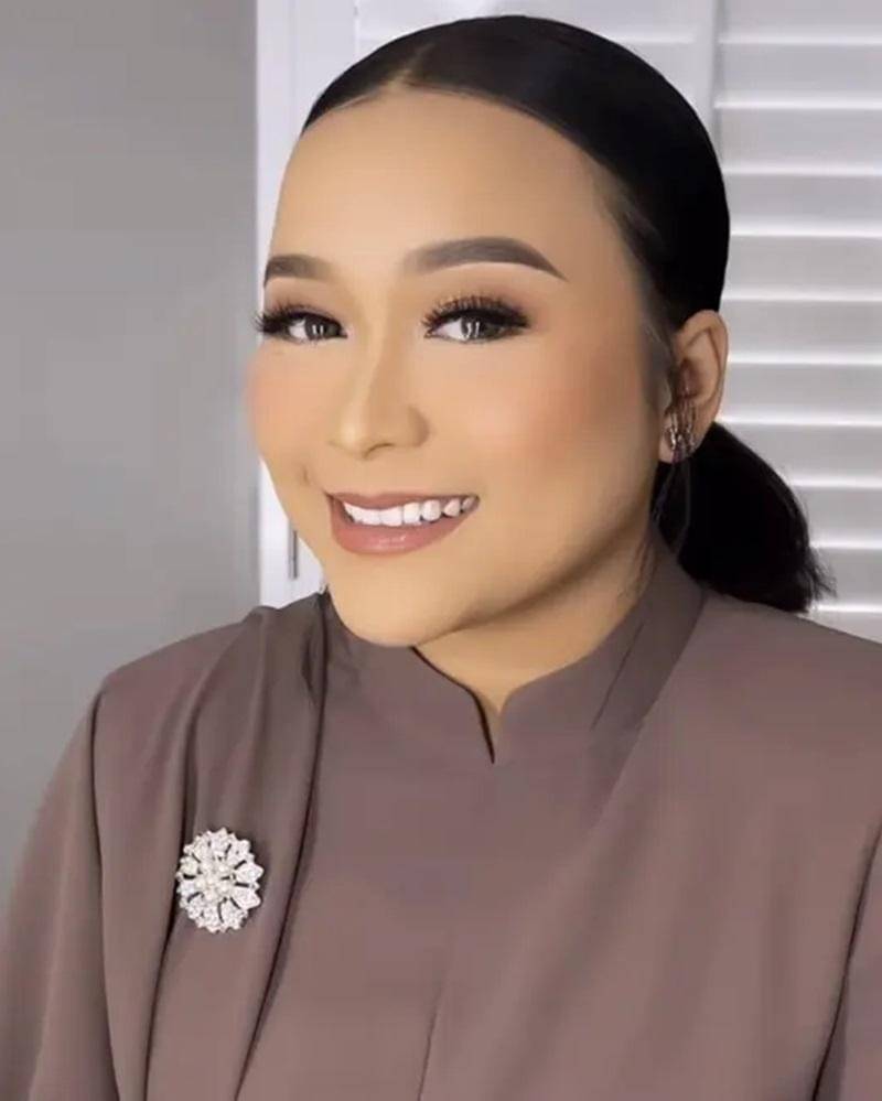 Untuk makeup, ia memilih warna kecoklatan yang senada dengan warna outfitnya.