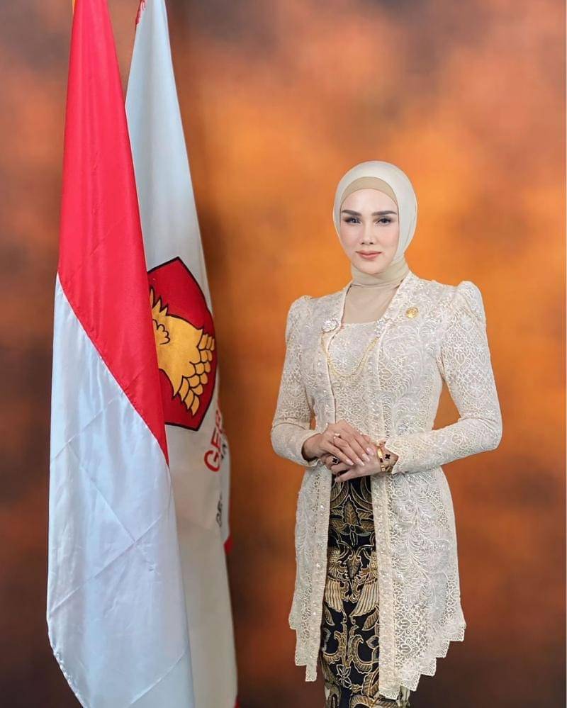 Ditambah hijab berwarna abu-abu yang anggun, keseluruhan look-nya memberikan kesan yang harmonis dan modis. Penampilan ini tidak hanya menunjukkan gaya, tetapi juga mencerminkan kepercayaan diri dan dedikasi Dina Lorenza dalam menjalani perannya di dunia politik.