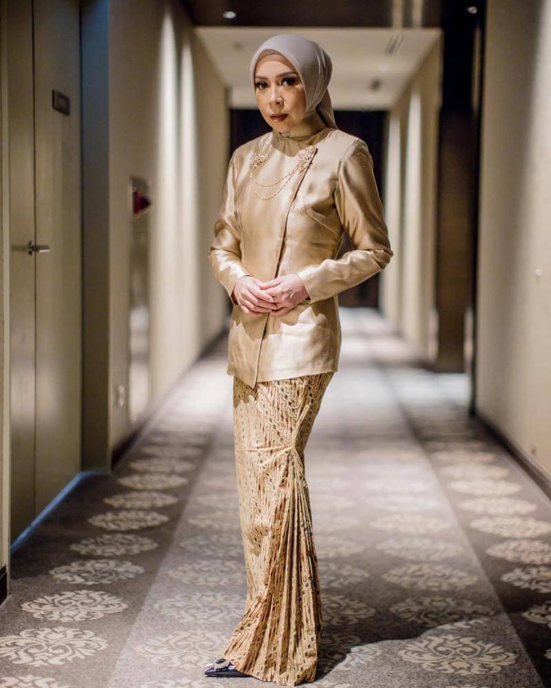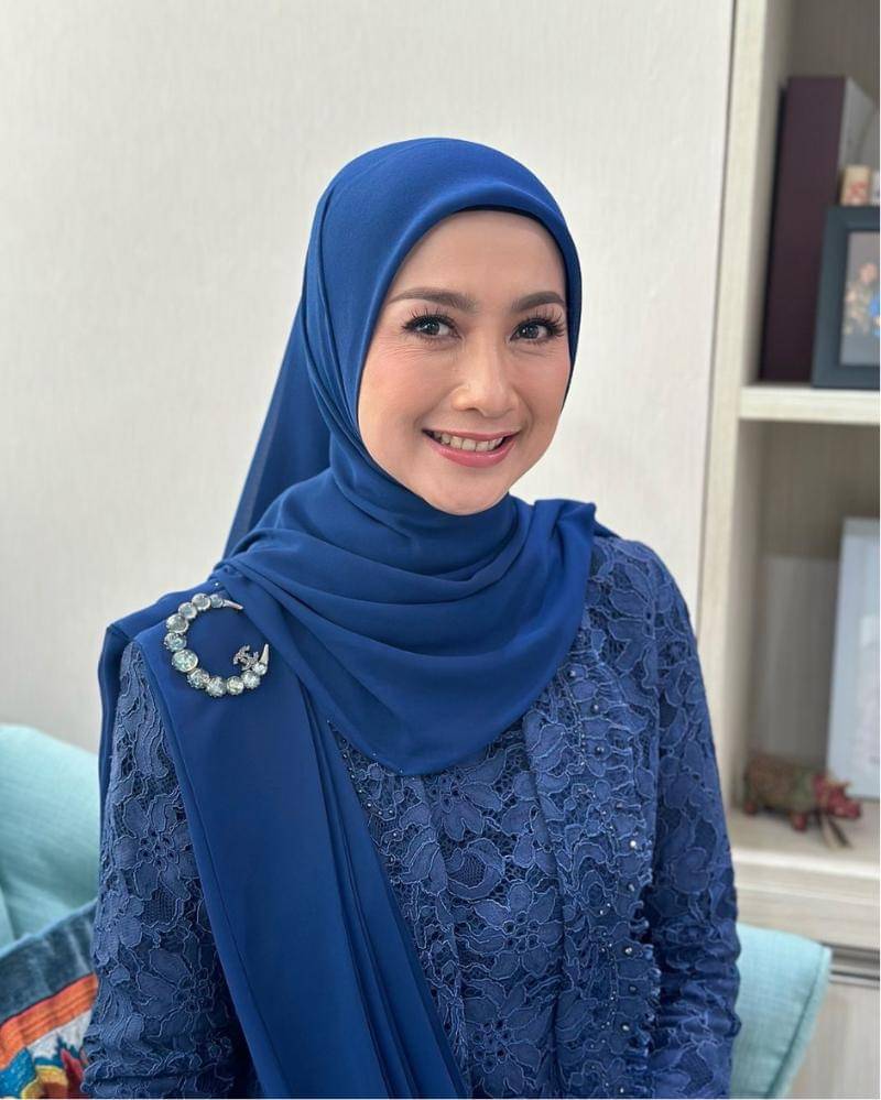 Untuk melengkapi penampilannya, Desy mengenakan kebaya brukat berwarna biru dongker yang elegan, semakin menambah pesonanya. Hijab yang dipilihnya juga senada dengan baju tersebut, ditata rapi dengan gaya Malay yang anggun.