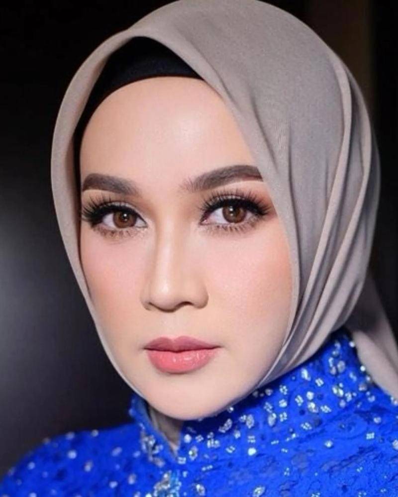 Tak hanya makeup yang mencuri perhatian, tetapi juga busana yang dikenakan. Dina memilih kebaya biru yang glamour, menambah kesan elegan pada penampilannya.