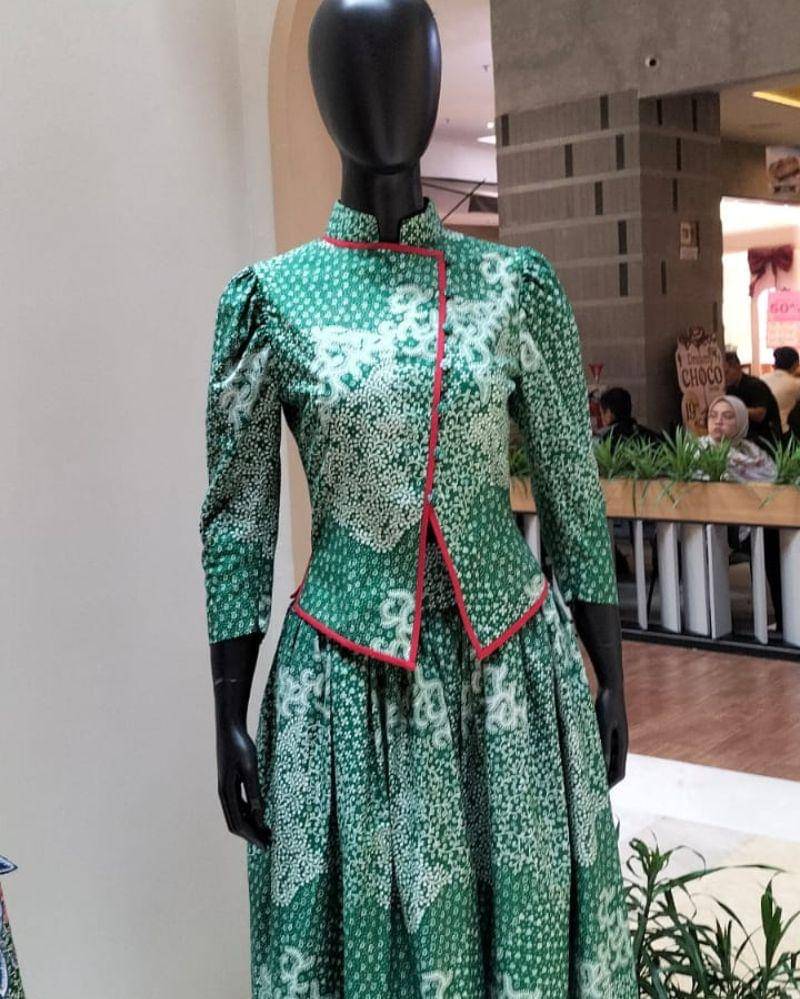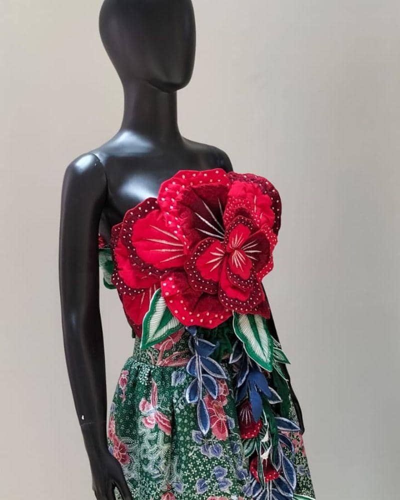 Bagian rok menggunakan kain bermotif batik bunga berwarna hijau dengan sentuhan merah dan biru, menciptakan harmoni antara elemen tradisional dan modern.