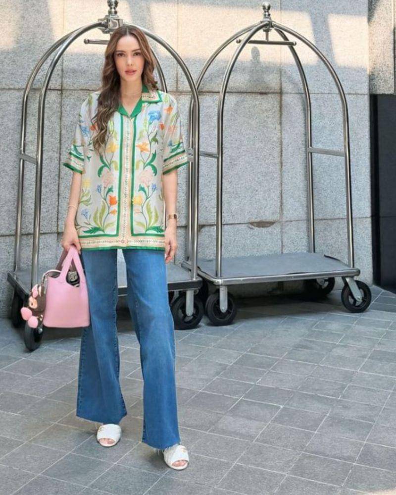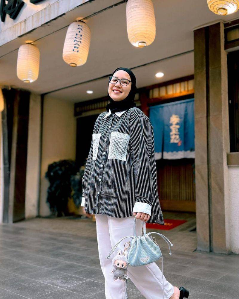 Siapa yang tidak kenal dengan ibu kos ini, yup Tya juga tidak mau ketinggalan tren. Ia memilih boneka Labubu Hehe dari seri "Have a Seat Vinyl" berwarna abu-abu. Labubu ini menjadi aksesori yang sempurna untuk tas birunya, menambahkan sentuhan playful pada gaya fashionnya.