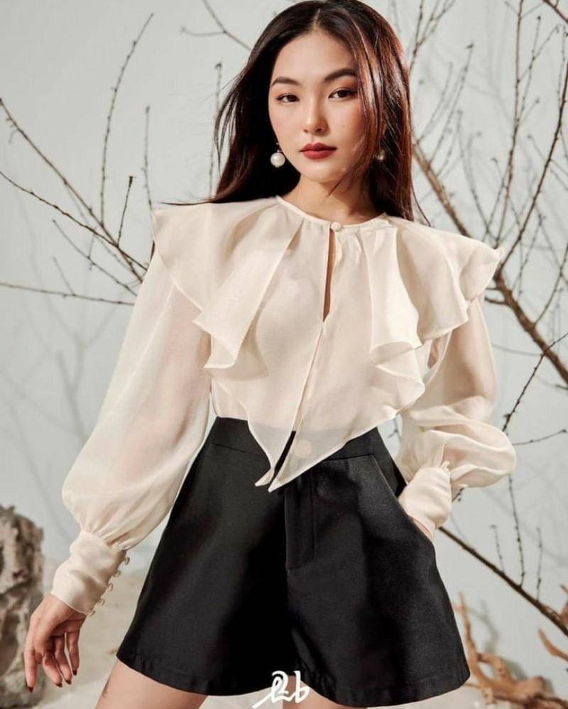 Warna pertama, tentu saja warna basic yang bisa masuk di semua jenis warna yaitu hitam. Atasan warna cream yang dipadukan dengan celana hitam memberikan kesan yang chic.